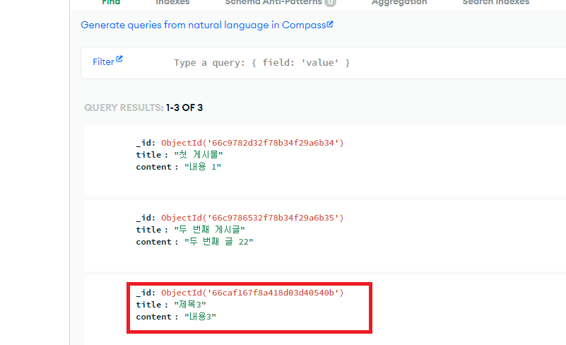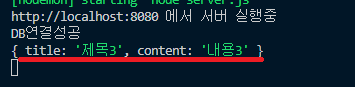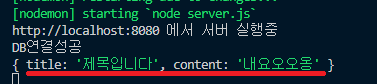 아까 ejs파일의 input태그에 name속성으로 작성해줬던 이름을 req.body.이름이런 식으로 해서 title과 content에 넣어주었다.