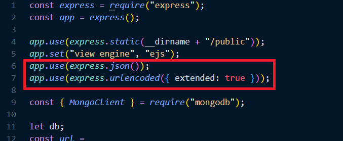server.js에서 POST요청을 처리해주는 코드 작성하는데, 출력을 해보기 위해 서버코드 상단에 app.use(express.json());