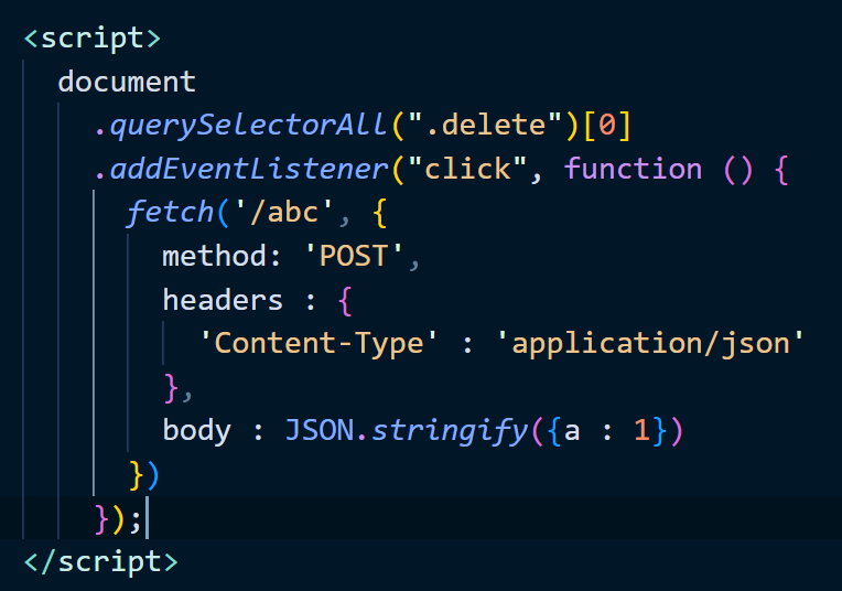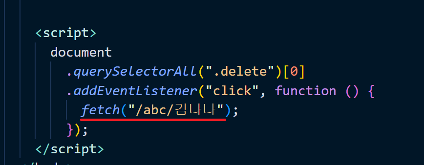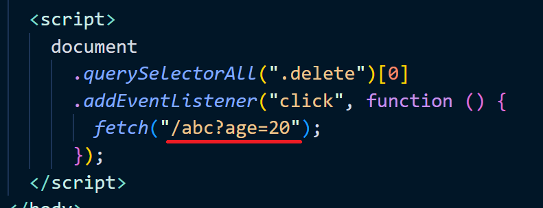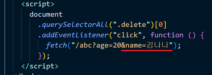 fetch함수 내에 fetch("/abc?데이터이름=데이터값"); 이렇게 써두면 뒤의 데이터값이 작성한 데이터이름으로 서버로 전송된다.