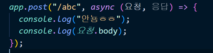 post요청이 되어 안뇽ㅎㅎ와 { a : 1 }이 콘솔창에 출력되어야 한다.