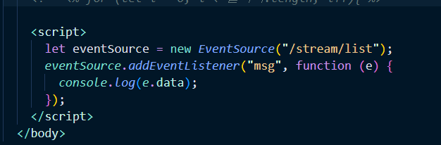 new EventSource('/URL') let eventSource = new EventSource('/stream/list')