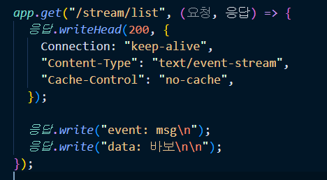이후, 응답.wrtie('데이터')로 실행할 때마다 유저에게 데이터를 쏴줄 수 있다.