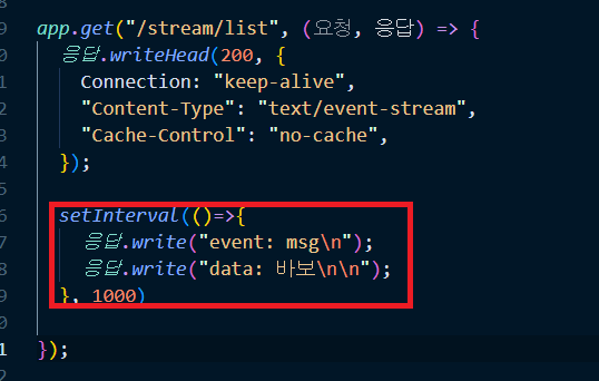 이후 서버로 돌아가서 setInterval을 사용해 1초마다 위에서 작성했던 응답.write코드가 실행되도록 만들어주자