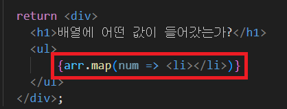 이제 그럼 JSX 문법 안쪽에 map함수를 사용하여 출력을 해보도록 하자.