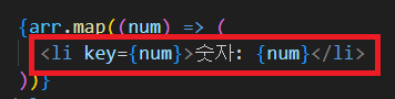key값을 지정할 때에는 map함수의 제일 처음 시작하는 요소에 아래 이미지처럼 key값을 넣어주면 된다.