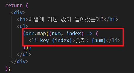 우선, map함수에서 사용할 수 있는 배열 내 값의 index를 사용할 수 있기 때문에 index로 key값을 잡은 예시이다.