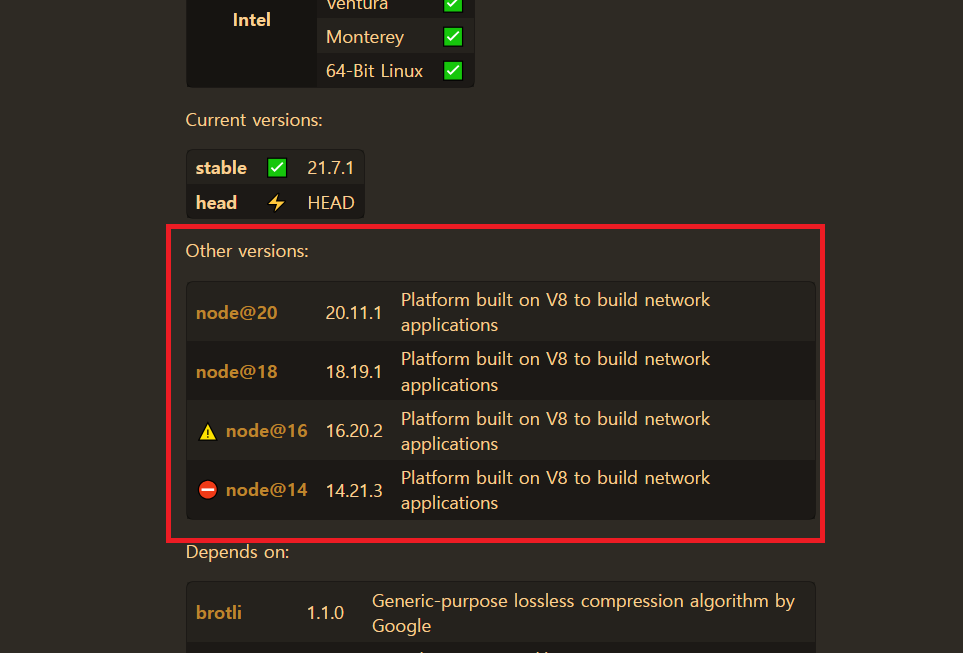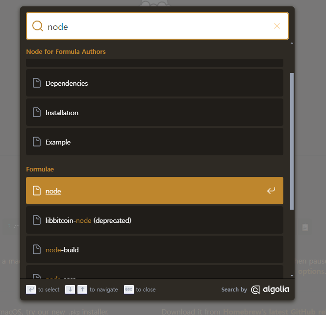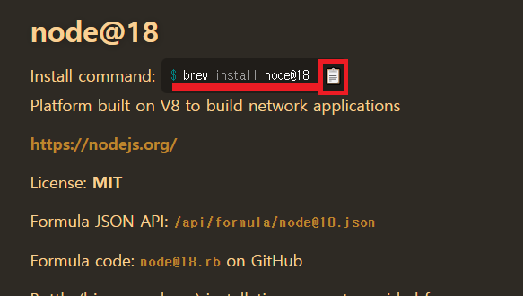 3. homebrew에서 node를 검색하여 아래처럼 클릭