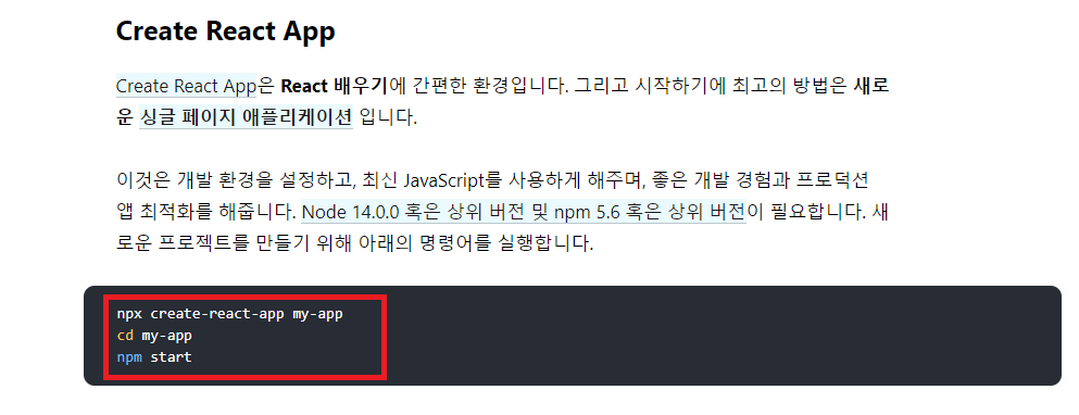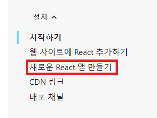 이렇게 새로운 React 앱 만들기가 보이는데, 해당 문장 클릭.