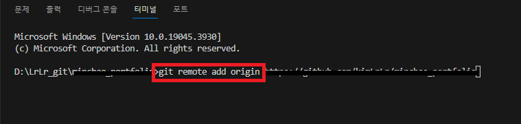 git remote add origin 저장소주소를 vs code의 cmd창에 입력