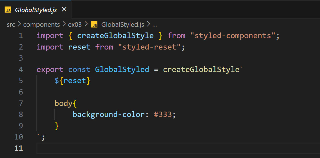 가능한 상위 폴더에 하는 것이 좋다고 생각해서 나는 index.js에서 App.js 위로 GlobalStyled를 넣어주었다.
