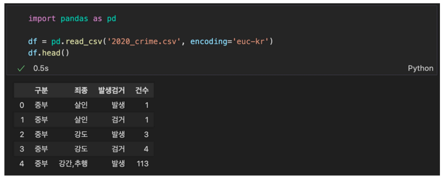 하지만 대한민국 사이트에서 제공받은 csv 파일들은 표준 인코딩 방식으로 때때로 euc-kr을 사용하는 경우도 있어 utf-8 인코딩이 작동하지 않는다면 조회할 때 euc-kr 을 사용하면 된다.