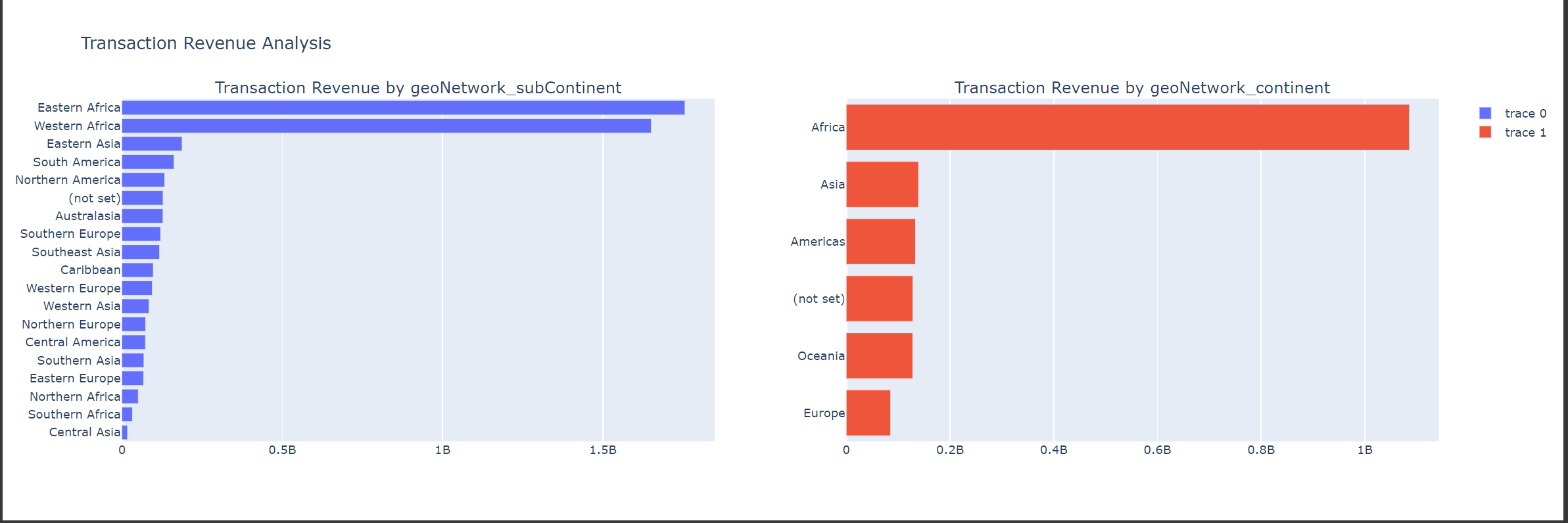 fig = make_subplots(rows=1, cols=2, subplot_titles=('Transaction Revenue by geoNetwork_subContinent', 'Transaction Revenue by geoNetwork_continent'))