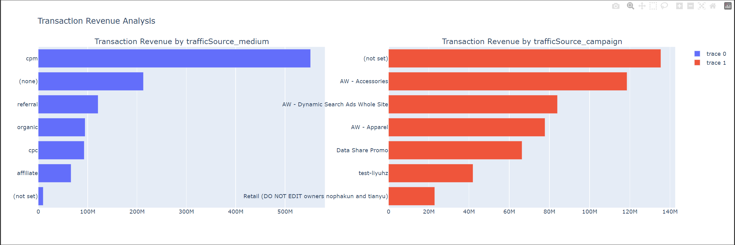 fig = make_subplots(rows=1, cols=2, subplot_titles=('Transaction Revenue by trafficSource_medium', 'Transaction Revenue by trafficSource_campaign'))