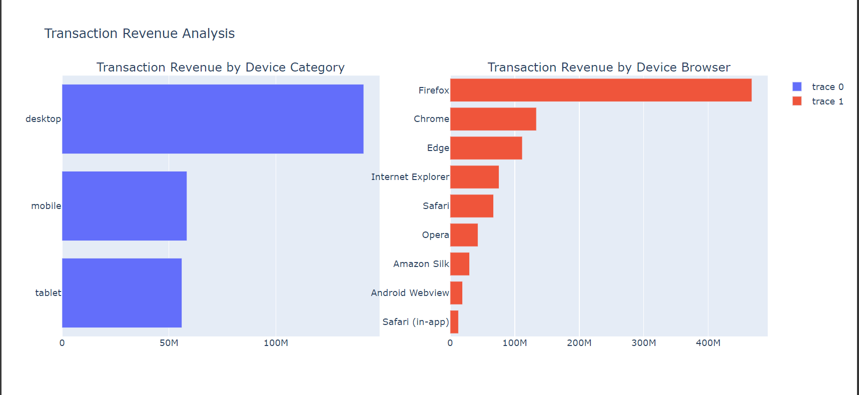 fig = make_subplots(rows=1, cols=2, subplot_titles=('Transaction Revenue by Device Category', 'Transaction Revenue by Device Browser'))