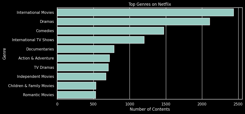 # ▶ 장르별 컨텐츠 분석을 위해 'listed_in' 열에서 각 장르를 분리하고 카운트합니다.