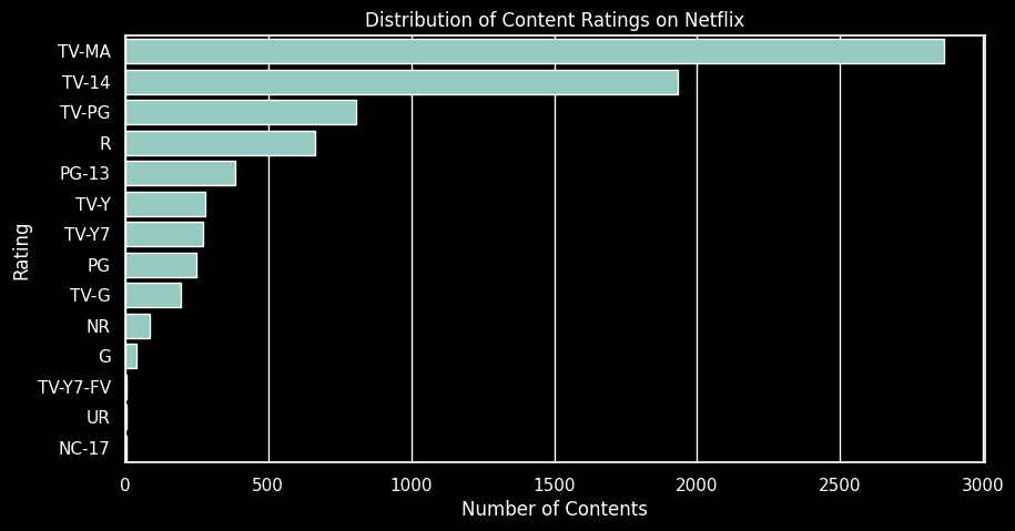 평점 분포 (Distribution of Ratings): 'TV-MA' (성인 대상) 등급의 컨텐츠가 가장 많고, 그 다음으로 'TV-14' (14세 이상 대상) 등급의 컨텐츠가 많다.