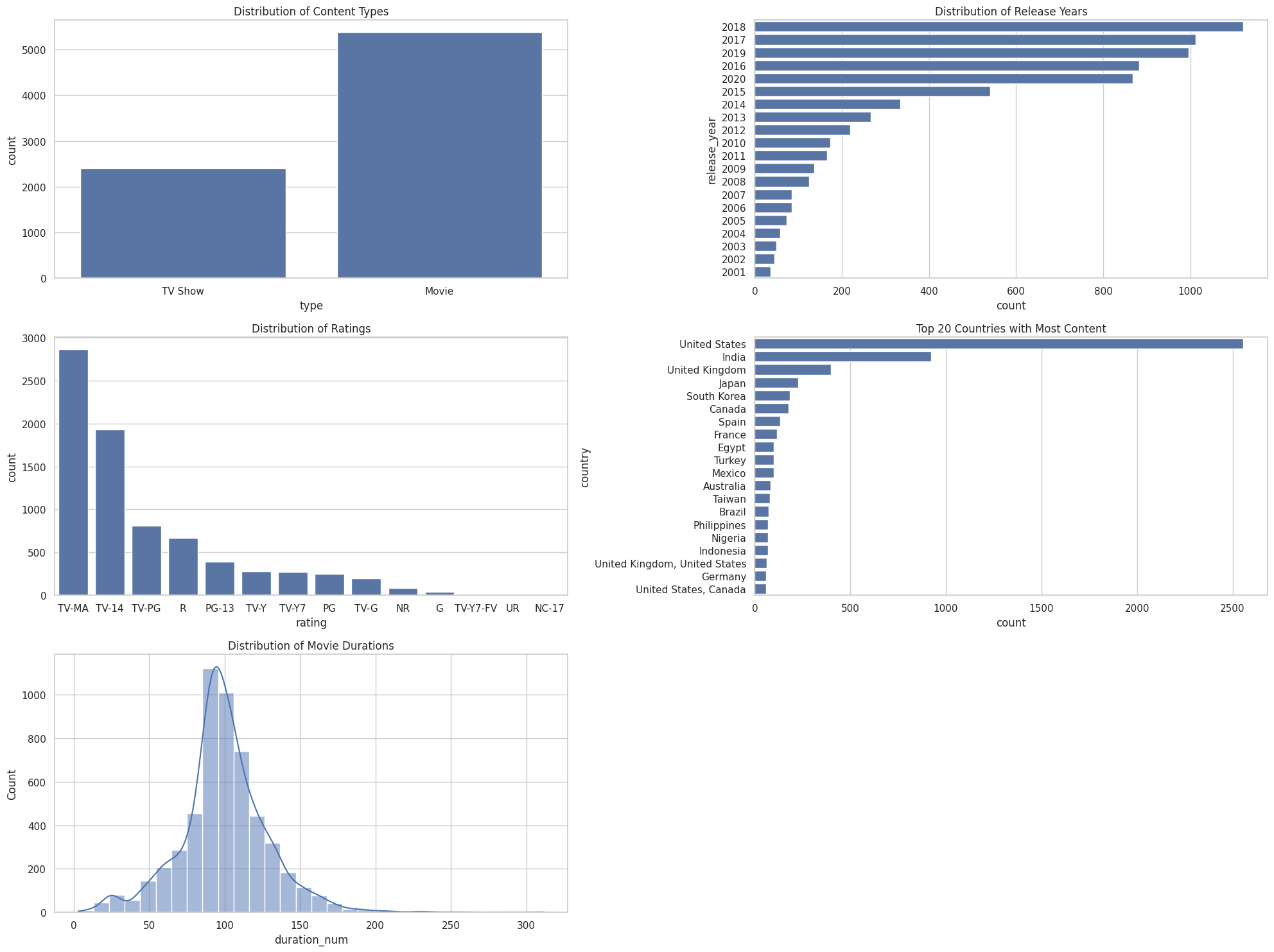콘텐츠 제작 국가 분포 (Top 20 Countries with Most Content): 미국이 압도적으로 많은 컨텐츠를 제작한 것으로 나타나며, 그 다음으로는 인도, 영국, 일본 순이다.