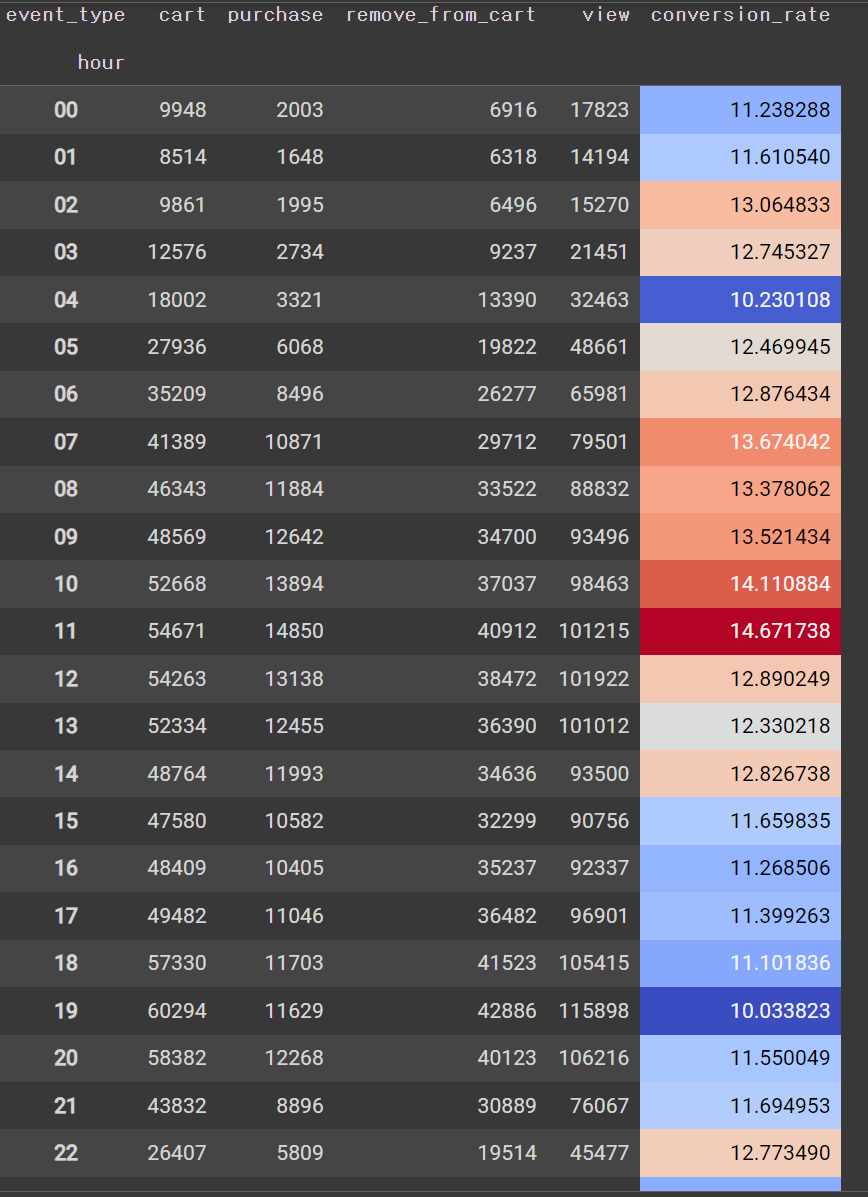 gradient 시각화로 데이터 프레임 내의 구매 전환율이 가장 높은 시간대를 살펴보니 오전 7시~11시 사이에 고객의 구매 전환율이 가장 높게 나오는 것을 확인할 수 있다.결론
