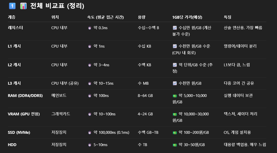 - CPU가 데이터를 읽는 속도와 비용에는 계층적인 차이가 존재