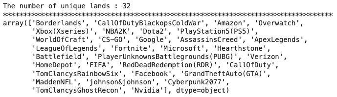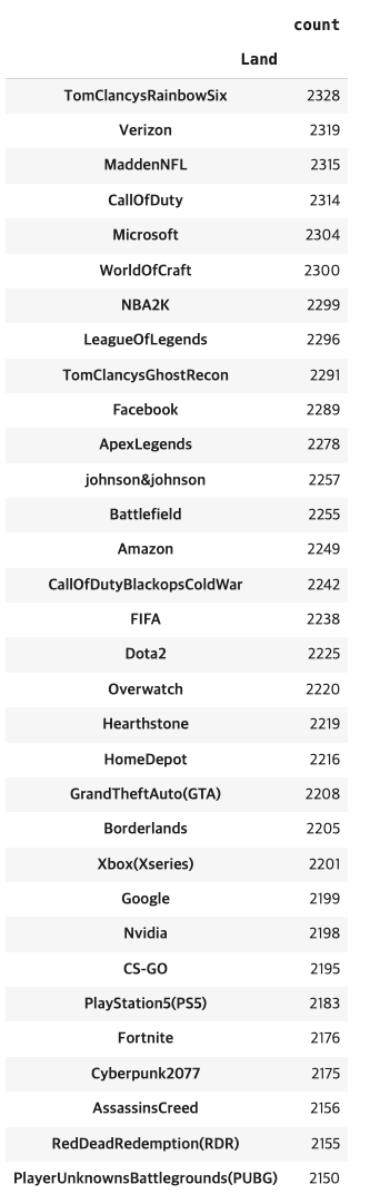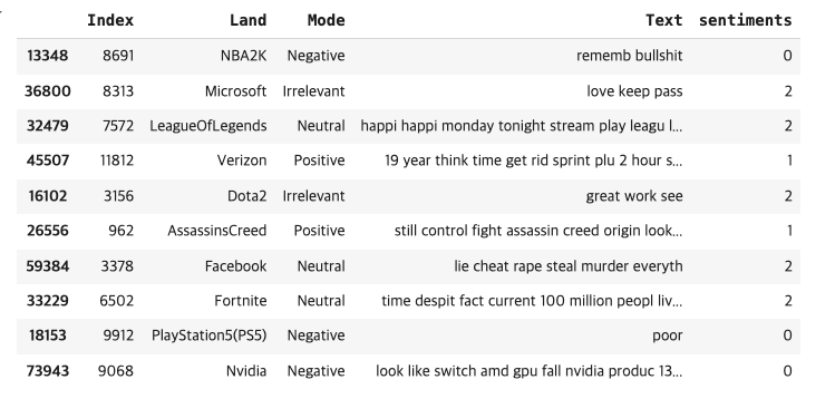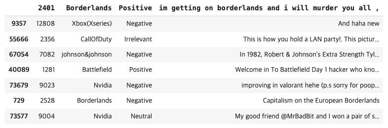 트위터의 엔티티 수준 감정 분석 데이터 세트 이며, 데이터세트는 긍정적, 부정적, 중립적으로 세가지 클래스로 되어있습니다. 여기서 중립적은 엔티티와 상관없는것을 중립적이라고 합니다.
