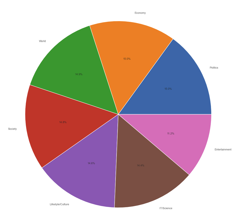 plt.pie(x=news.category.value_counts(), labels=news.category.value_counts().index, autopct='%1.1f%%', textprops={'fontsize': 8, 'alpha': .7})