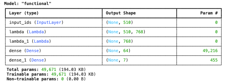 bert_output = Lambda(apply_distilbert, output_shape=lambda s: (s[0], 510, 768))(input_ids)