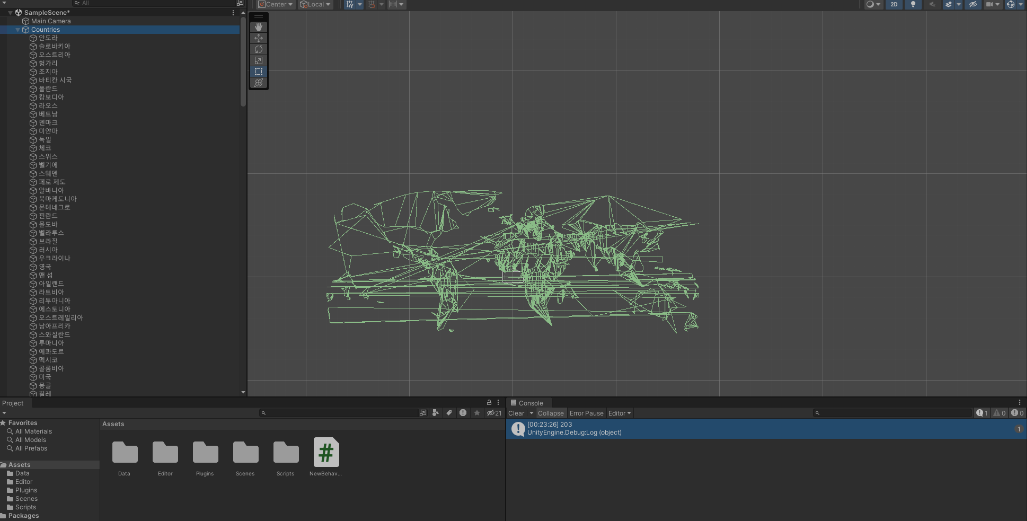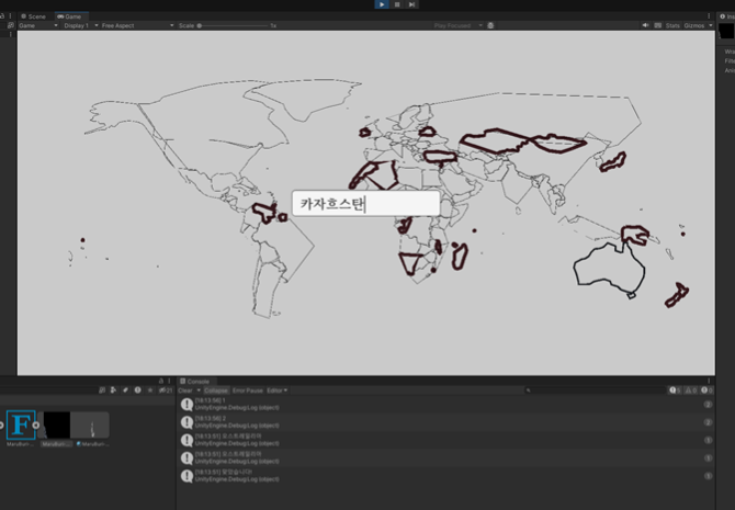 에디터 레벨에서 JSON 파일을 다운로드받고, 각 나라의 국가경계선 좌표를 PolygonCollider2D에 넣어주는 식으로 오브젝트를 생성하면 이렇게 나온다.
