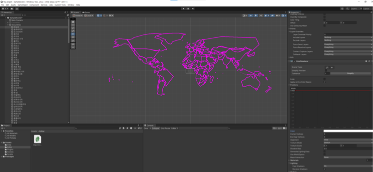 파이썬에서 만들어온 JSON 파일로 오브젝트를 다시 만들고, LineRenderer라는 걸 이용해서 콜라이더를 시각화했다. 국가를 가로지르는 선이 없는 걸로 보아 세그먼트 정렬이 올바르게 됐음을 알 수 있다.