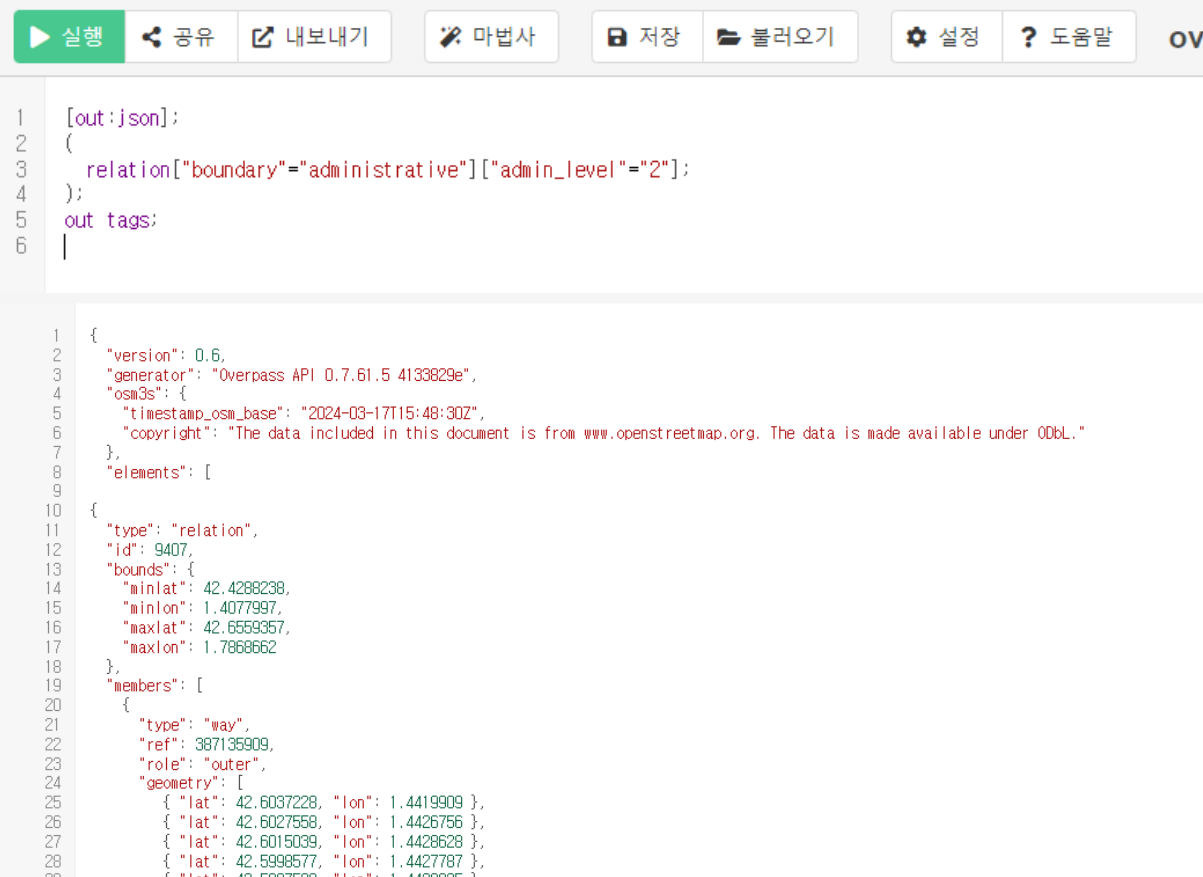 OSM에서 JSON 파일을 쉽게 뽑아올 수 있는 사이트가 또 있더라. 거기서 Overpass QL로 뭔가 이리저리 굴려주면 다양한 형태의 데이터를 얻을 수 있다.