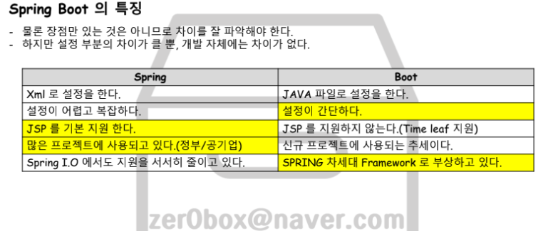 □ port, encoding, jsp, database, mybatis, mapper location, alias-package, logging-level, connection pool(default) 등등-> 기존 spring 프로젝트에서 srvlret, .xml 등에서 설정 및 라이브러리 추가하는걸