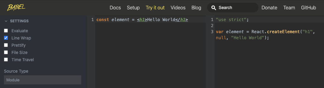 이렇게 바벨이라는 툴이 JSX를 브라우저가 읽을 수 있게 JavaScript로 바꿔주는 역할을 하는 것입니다.