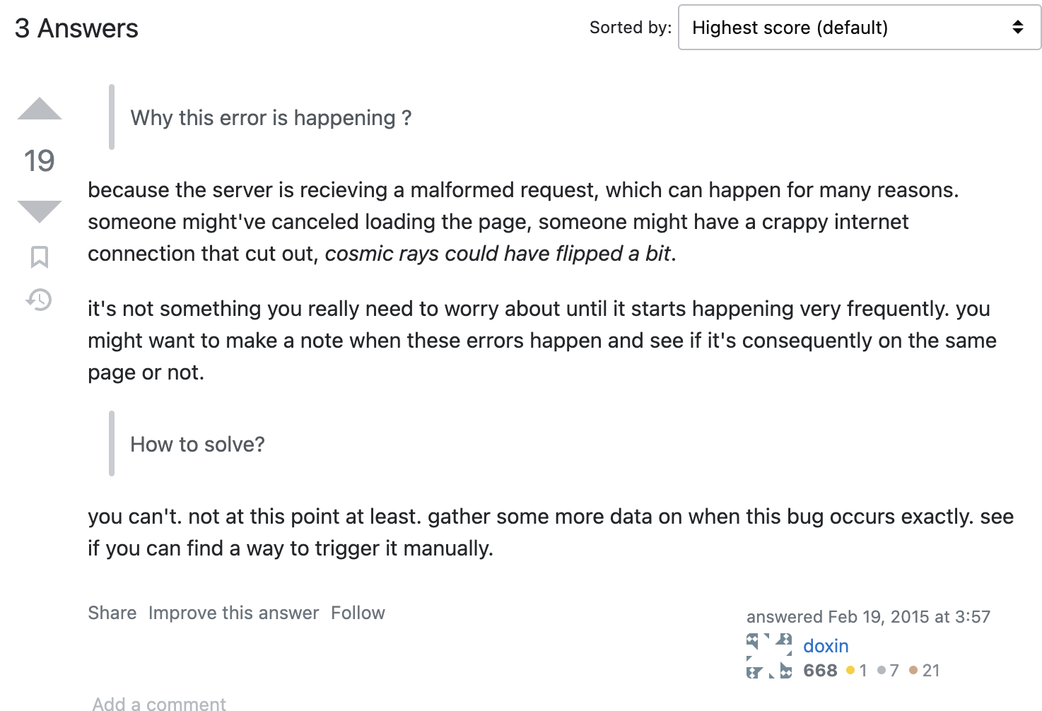 스택오버플로우를 찾아보니 대략적으로 설명하자면 서버 쪽에서 다양한 요인으로 인해 잘못된 형태의 요청을 받는 경우 위의 오류가 날수 있다고 합니다.