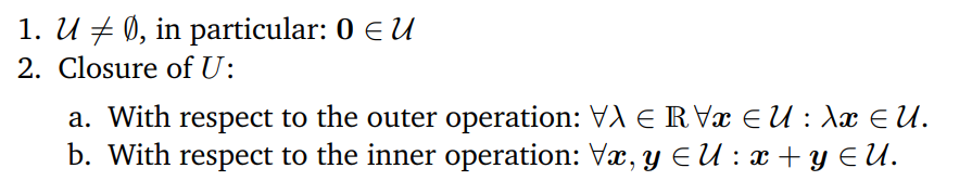 =(V,+,⋅) 가 vector space이고, U⊆V, U!=0 라고 할 때, =(U,+,⋅) 을 의 vector subspace라고 한다.U⊆V 이고 가 vector spcae라면,