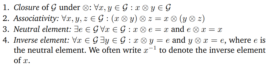 집합 G과 연산 ⊗:G×G→G 가 G 에 대해 정의되어 있을 때, 아래의 조건을 만족하는 :=(G,⊗)를 군이라고 부른다.