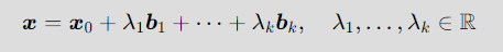 의 affinespace이다. 특히 의 해는 에서의 hyperplane이다. 에서 모든 k-차원의 affine subspace는 inhomogeneous한 연립선형방정식 의 해이다. 또한, Homogeneous 연립방정식 의 해가 vector subspace라는 것을 떠올려보면, 이는 support point $x_0 가 0인 특별한 affine space라고 할 수 있다.