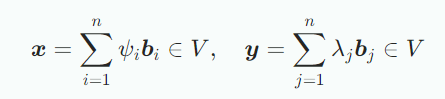 inner product 인 n차원 벡터공간 와 기저 가 있을 때, 모든 벡터 는 basis vector의 선형결합으로 표현가능하므로 다음과 같다.