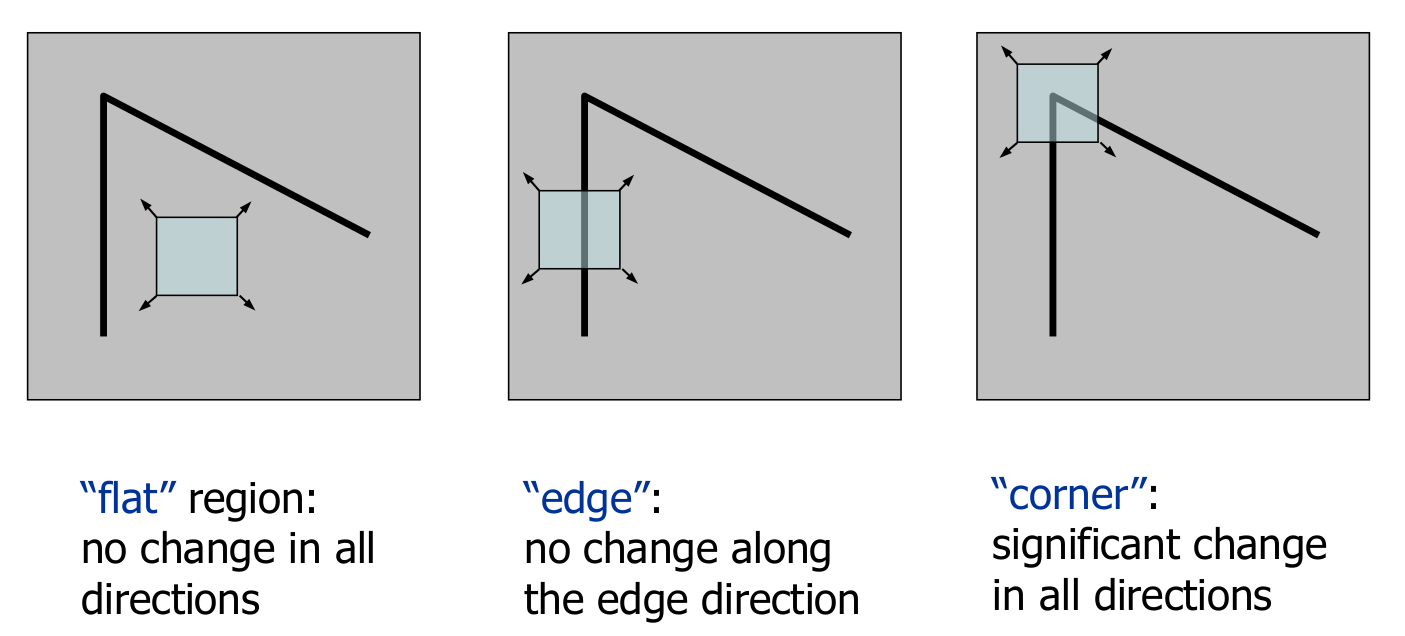 interest point를 찾기 위한 방법으로 pixel을 움직여 봤을 때, 변화에 따라 공간의 case를 판단하는 방법으로 모든 방향에서 변화가 없으면 "flat", edge방향에서 변화가 없으면 "edge", 모든 방향에서 변화가 있으면 "corner"판단한다.
