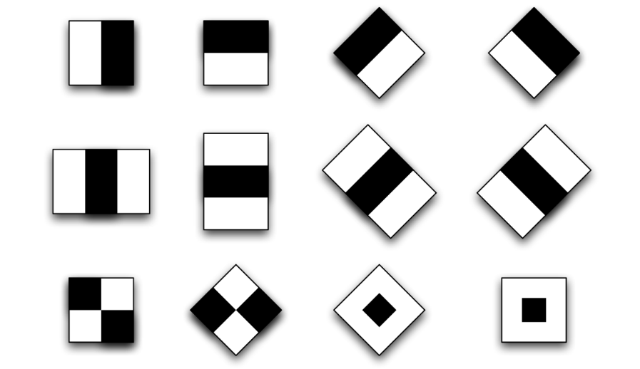 사람의 얼굴에는 특별한 패턴이 있는데, 두 눈은 명암이 어둡고 코는 명암이 밝은 등의 명암을 이용해 패턴을 구하는 방법이 haar like features이다. 이미지에 흑백의 사각형을 겹쳐 놓은 다음 하얀 영역에 속한 픽셀 값들의 평균에서 검음 영역에 속한 픽셀값들의 평균의 차이를 구한 다음 임계값 이상일 경우 이 영역을 haar like features로 지정할 수 있게 된다.