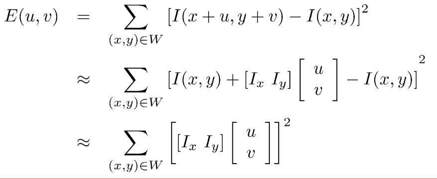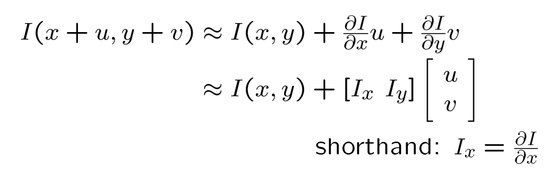 gradient를 이용해서 x축으로 u만큼 y축으로 v만큼 움직였을 때의 pixel값을 유추하는 방법으로 테일러 급수를 사용한다.