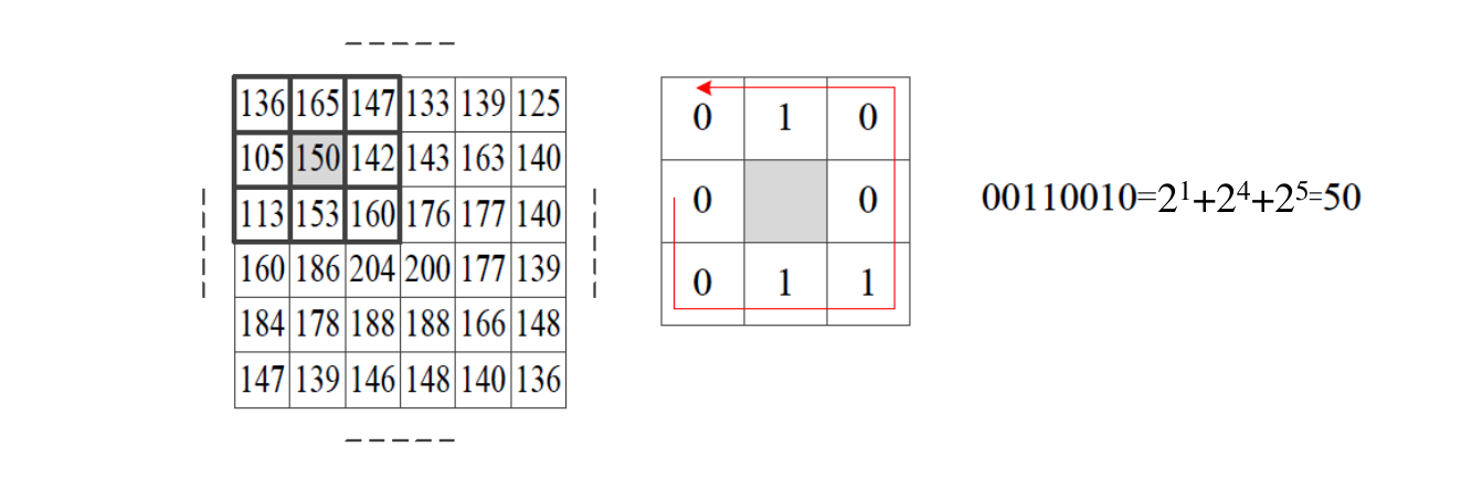 block의 가운데 pixel 값을 임계값으로 하여 0과 1로 binary하게 나타내어 이진수나 십진수로 표현하는 방법으로 gray level의 intensity change에는 invariant하며 연산적으로 단순하다는 장점이 있다.