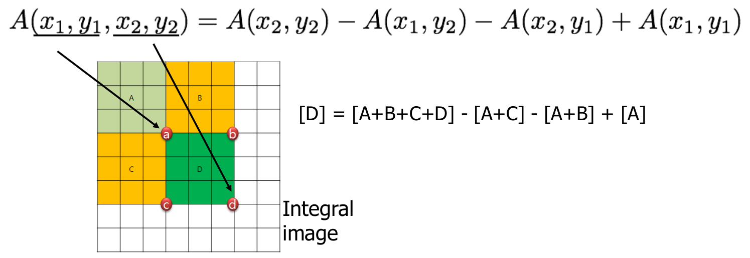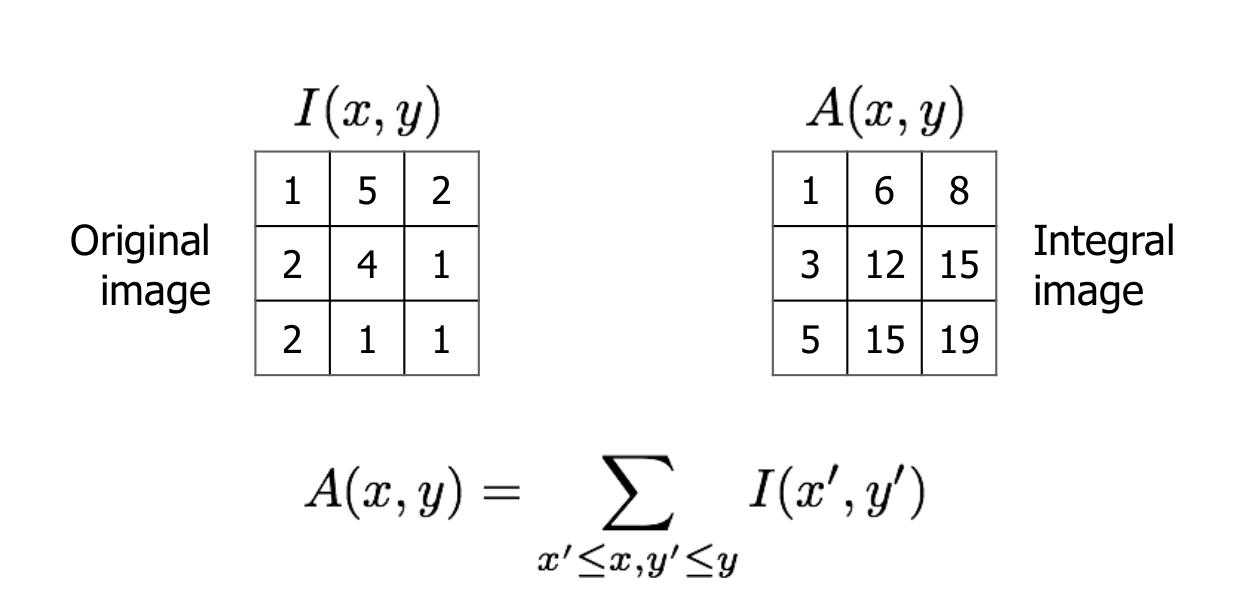 그러나 이러한 방법들은 연산이 너무 많이 걸린다는 단점이 있다. 이를 해결하기 위해 integral image를 사용한다.