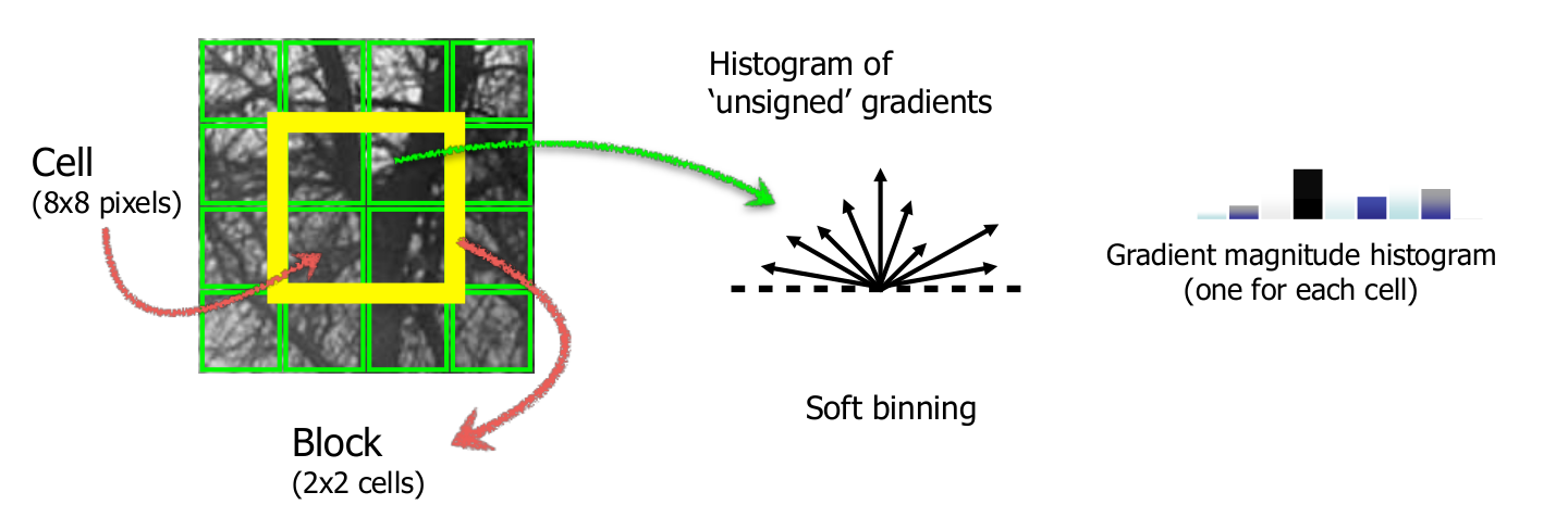 cell을 나누고 gradient를 계산한 후 direction별 magnitude를 계산하여 histogram으로 바꾼 후 각 cell들의 histogram을 하나로 합쳐 이를 비교하여 유사도를 계산하는 방식이다.