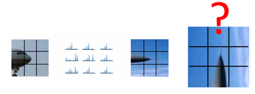 patch내의 RGB의 색을 세어서 히스토그램으로 만든 것으로 small defomation이나 rotation이 발생해도 color histogram은 invariant하다는 장점이 있으나 공간정보가 없어서 비스한 색의 분포를 가지는 전혀 다른 object를 같은 object로 인식한다는 단점이 있다.