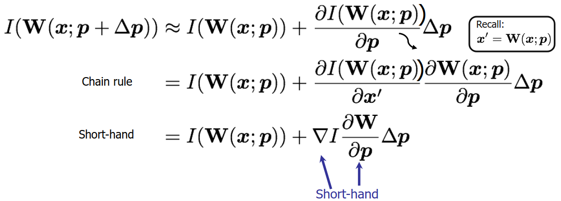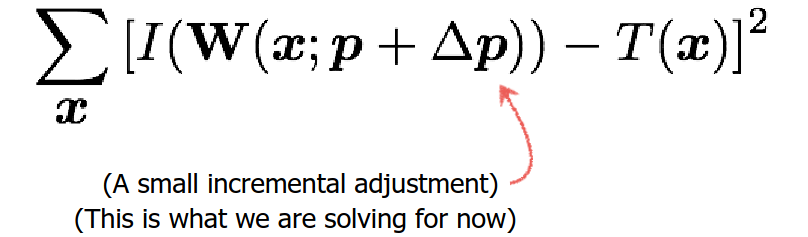 이러한 alignment를 더 쉽게 하기 위한 방법으로 Lucas-Kanade alignment라는 방법이 있다. 이 방법은 p를 바로 찾기 보다 좋은 initial position에서 시작하여 p의 small increment를 찾는 방법이다.