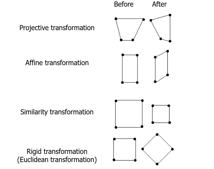 affine transformation: 직선간 길이 비율과 평행 관계가 유지되는 transformation