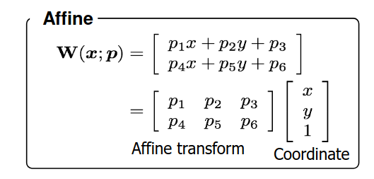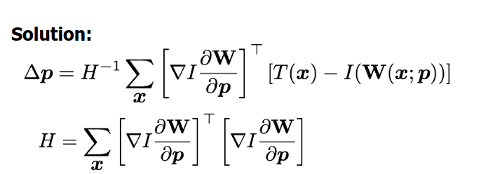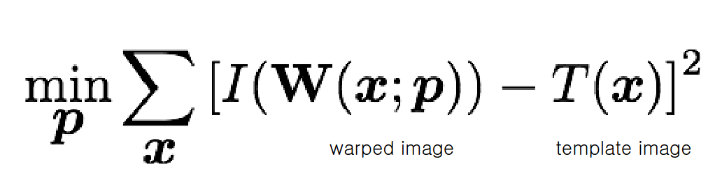 algignment warped image와 template 이미지와의 pixel값의 ssd를 최소화 하는 parameter set p를 찾아야 한다.