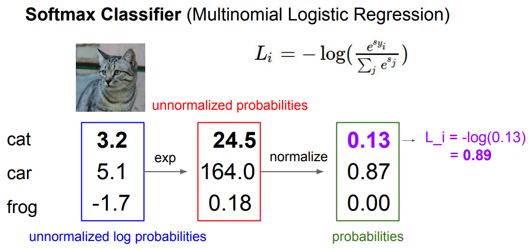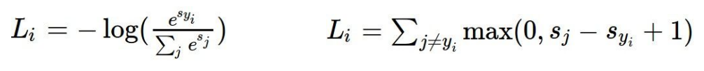 Linear Classification의 설정은 둘 다 같은 조건이고, 행렬 W와 입력이 불가능하다는 것도 같다. 다만 두 손실함수는 "badness"를 측정하기 위해 스코어를 해석하는 방식에 차이가 있다.