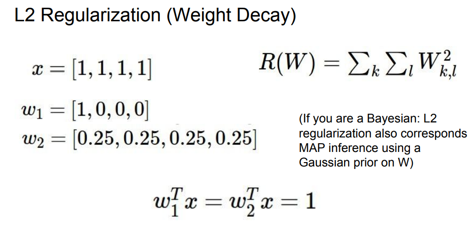 예제에서 L2 regression는 를 더 선호할 것이다. 왜냐하면 의 가중치가 더 작고 더 분산되기 때문이다.