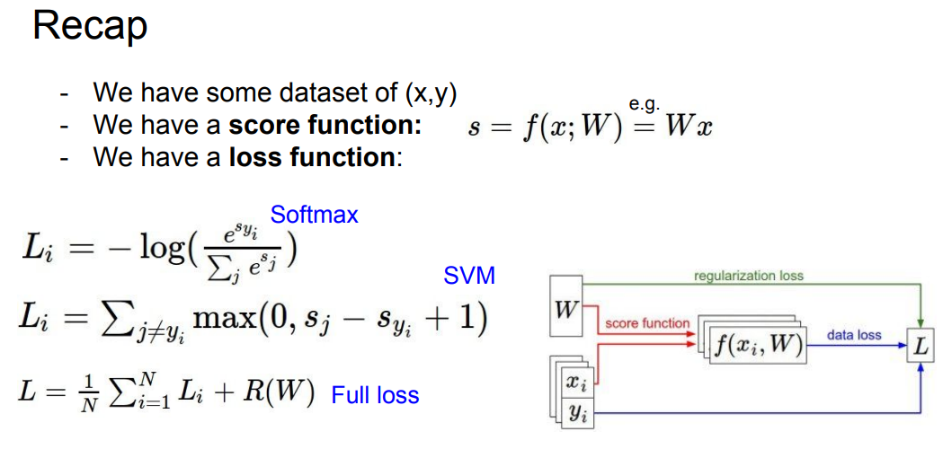 손실함수(Loss function)란, 학습 데이터를 통해 얻은 W(weight matrix)를 사용하여 label을 예측하였을 때 W가 얼마나 못 예측하였는지(badness)를 정량적으로 알려주는 역할이다. 즉, 손실함수가 높을 수록 예측을 못한 것이다. 이러한 손실함수가 낮은 W를 찾아가는 과정을 최적화(Optimization)라고 한다.