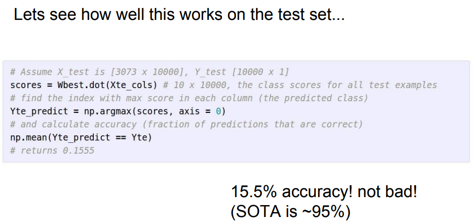 CIFAR-10 dataset을 이용하여 Linear classfier을 학습시킨 결과 15%의 정확도를 보였다. 이와 같이 정확도가 매우 낮으므로 실제로 사용하기에 부적절하다.